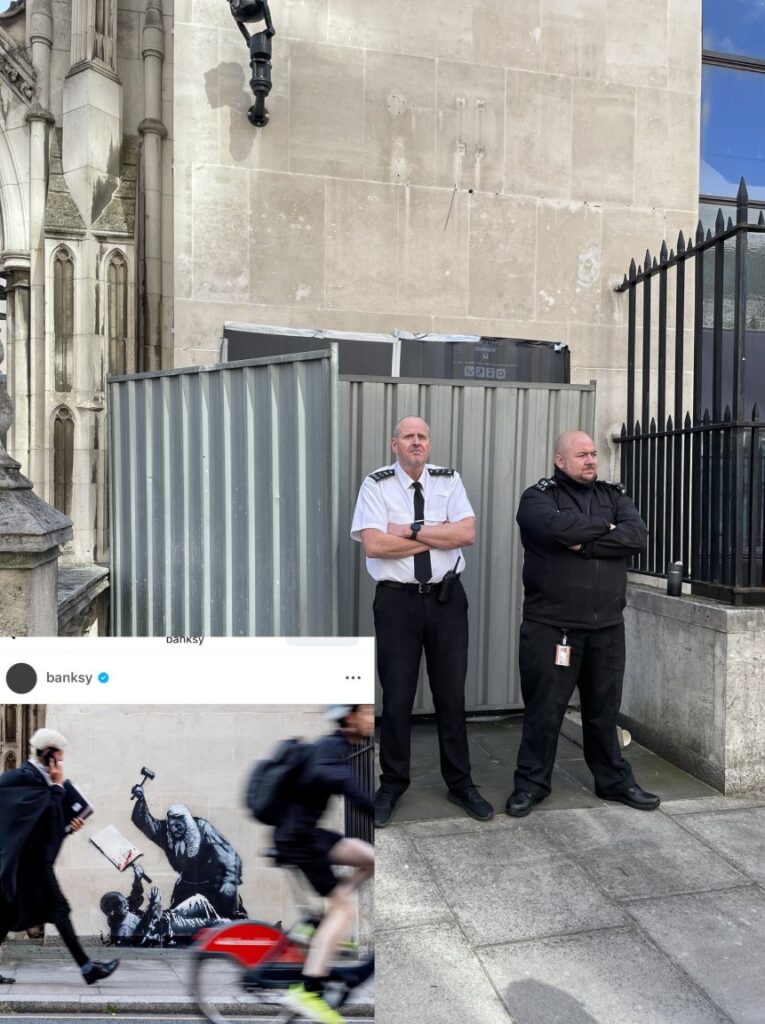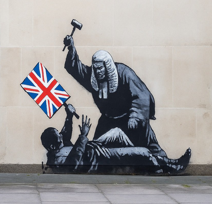 Na manhã de 8 de setembro de 2025, um mural provocador de Banksy surgiu na parede exterior dos Royal Courts of Justice, em Londres. A obra retrata um juiz, trajado, peruca e toga, a golpear com um martelo um manifestante prostrado no chão, segurando um cartaz ensanguentado, poderoso de violência judicial e repressão da protestação. A autoria foi confirmada pelo artista através de um post no Instagram.