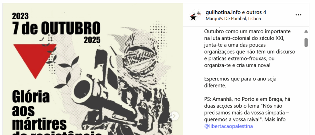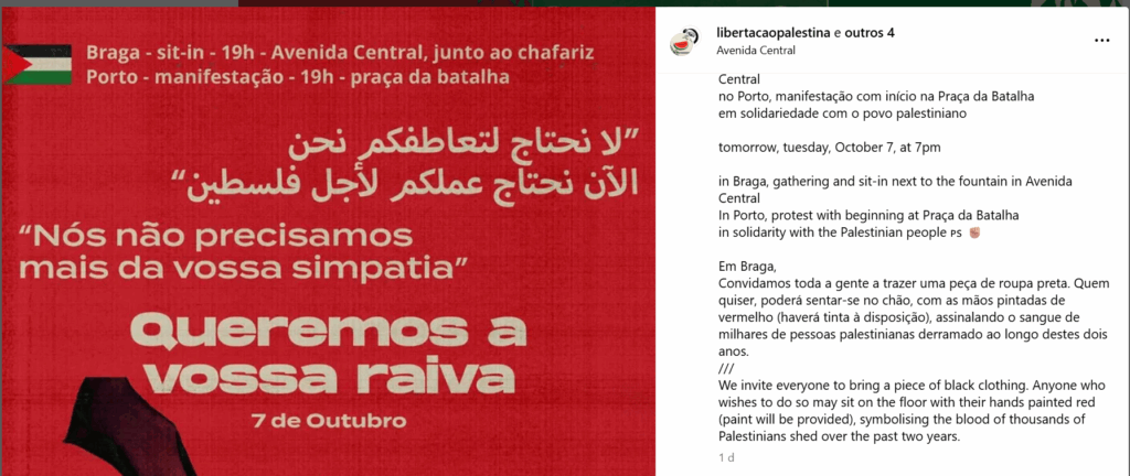 Verdadeiro – a manifestação foi convocada na página de instagram do guilhotina.info , assim como foi partilhado no instagram de libertacaopalestina , embora o primeiro cartaz apenas refira que seria em Lisboa às 19h, é confirmado que a mesma terá lugar em Porto e Braga com uma denominação diferente.